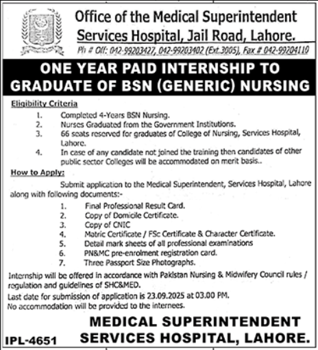 Only male candidates can apply for .Medical Superintendent Services Hospital Jobs in Lahore, September 2025 Qualification /Experience Required: Completed 4-Year BSN Nursing Nurses Graduated from the Government Institutions 66 seats reserved for graduates of the College of Nursing, Services Hospital, Lahore, and more experienced candidates should apply before 23 September 2025.