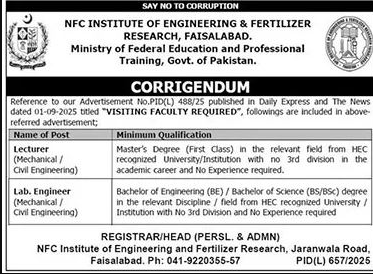 NFC Institute Of Engineering Jobs In Faisalabad September 2025 Advertisement
