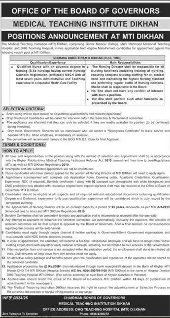 Only male candidates can apply for the Office Of The Board Of Government Jobs In Dikhan October 2025 Qualification /Experience Required: Qualified Nurse with an advanced degree in Nursing (B.Sc Nursing) having current Nursing Councils Registration, preferably MSCN with at least seven yearsof Administrative and Teaching experience in a reputable Health Care Facility and more experienced candidates should apply before 06 October 2025.