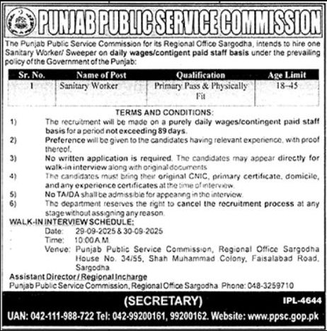 Candidates if you are seeking Punjab Public Servic Commission Jobs In Sargodha September 2025 if yes. It would be best if you tried to complete read Punjab Public Servic Commission job because you can easily apply for these vacancies Sanitary Worker. Only male candidates can apply for Punjab Public Servic Commission Jobs In Sargodha September 2025 Qualification /Experience Required:Primary Pass & Physically Fit, and more experienced candidates should apply before 29 September 2025.