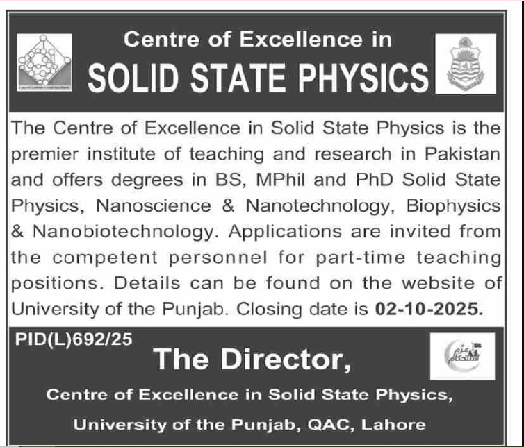 Candidates, if you are seeking Solid State Physics University Jobs In Lahore, September 2025 if yes. It would be best if you tried to complete reading Solid State Physics University job because you can easily apply for these vacancies Centre of Excellence.